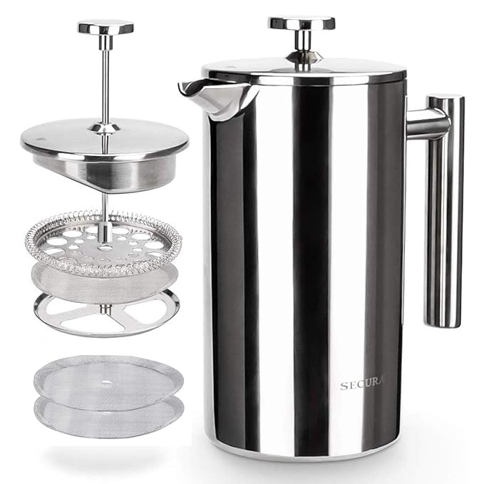 Secura French Press Coffee Maker, 304 Grade Stainless Steel Insulated Coffee Press with 2 Extra Screens, 34oz (1 Litre), Silver Todays Deals Jan 5 Written By flipmodearmyceo Secura French Press Coffee Maker, 304 Grade Stainless Steel Insulated Coffee Press with 2 Extra Screens, 34oz (1 Litre), SilverYOUR PRICE:$21.65 & FREE ShippingYOU SAVE:$18.34 (46%) flipmodearmyceo
